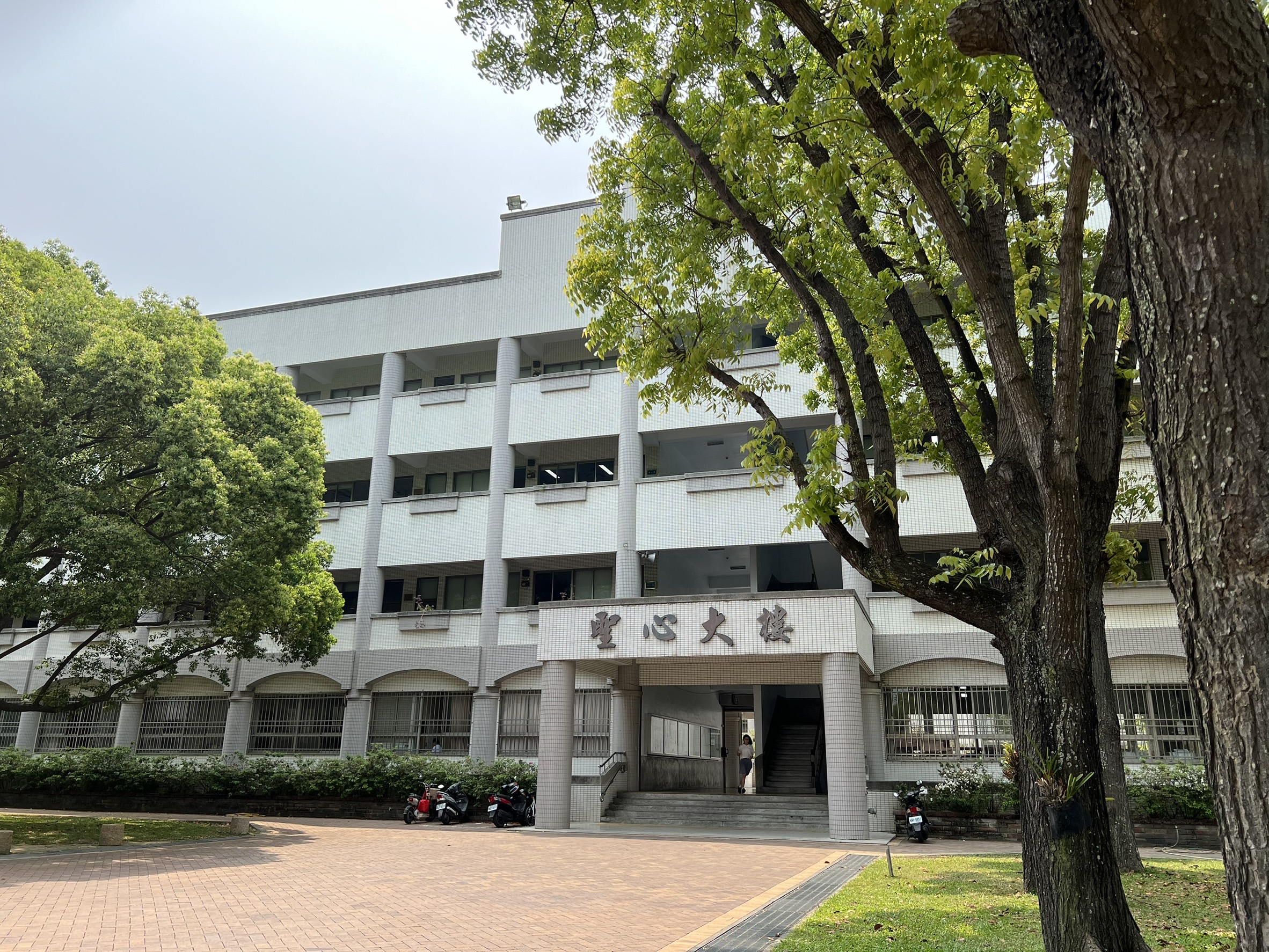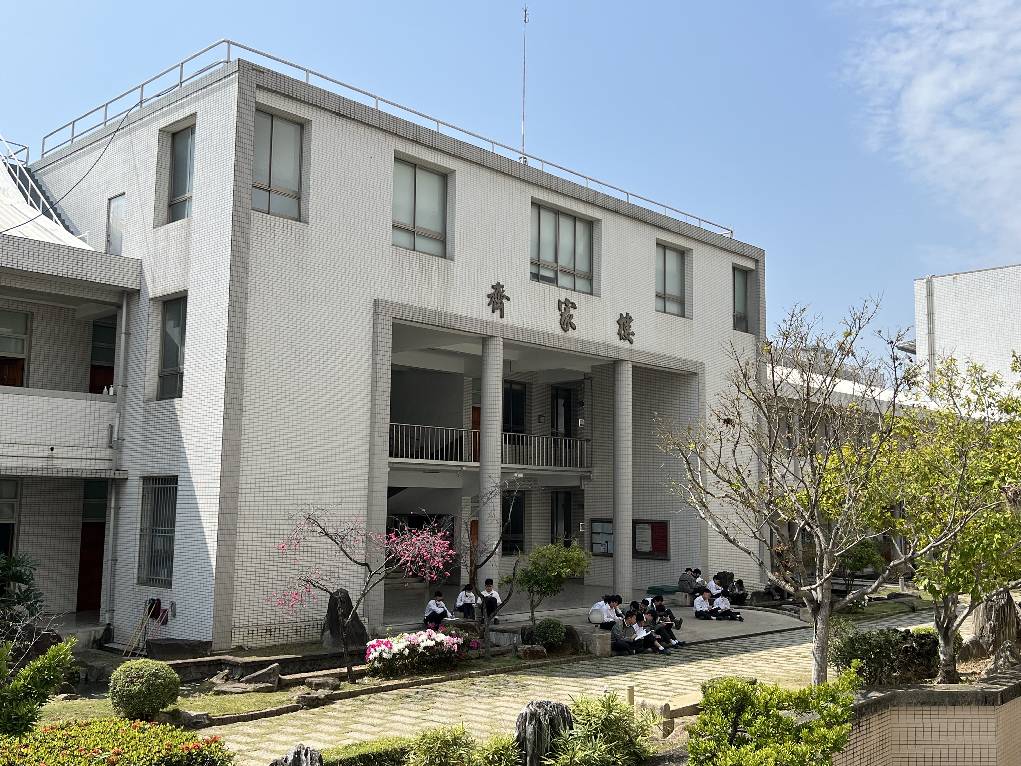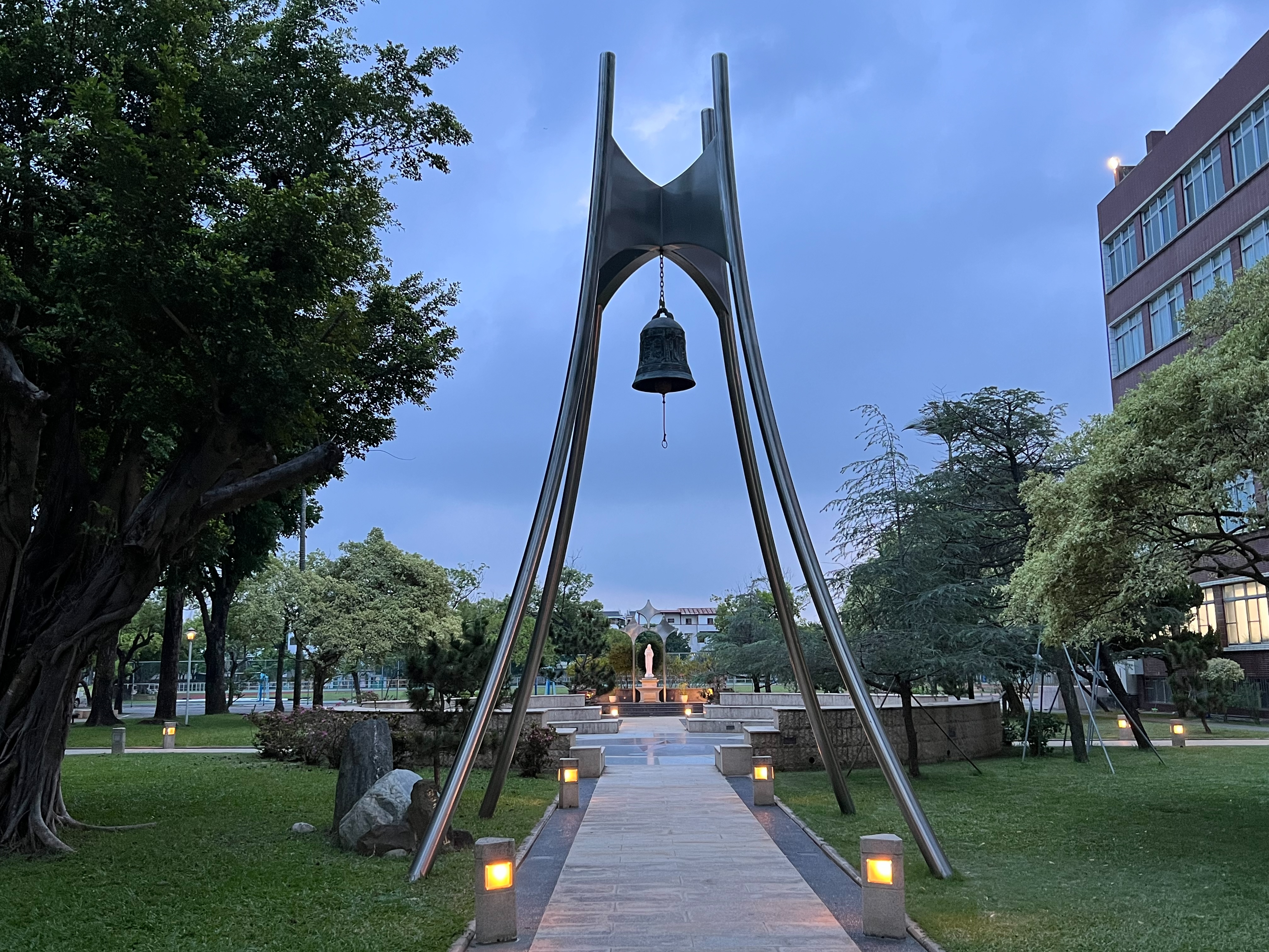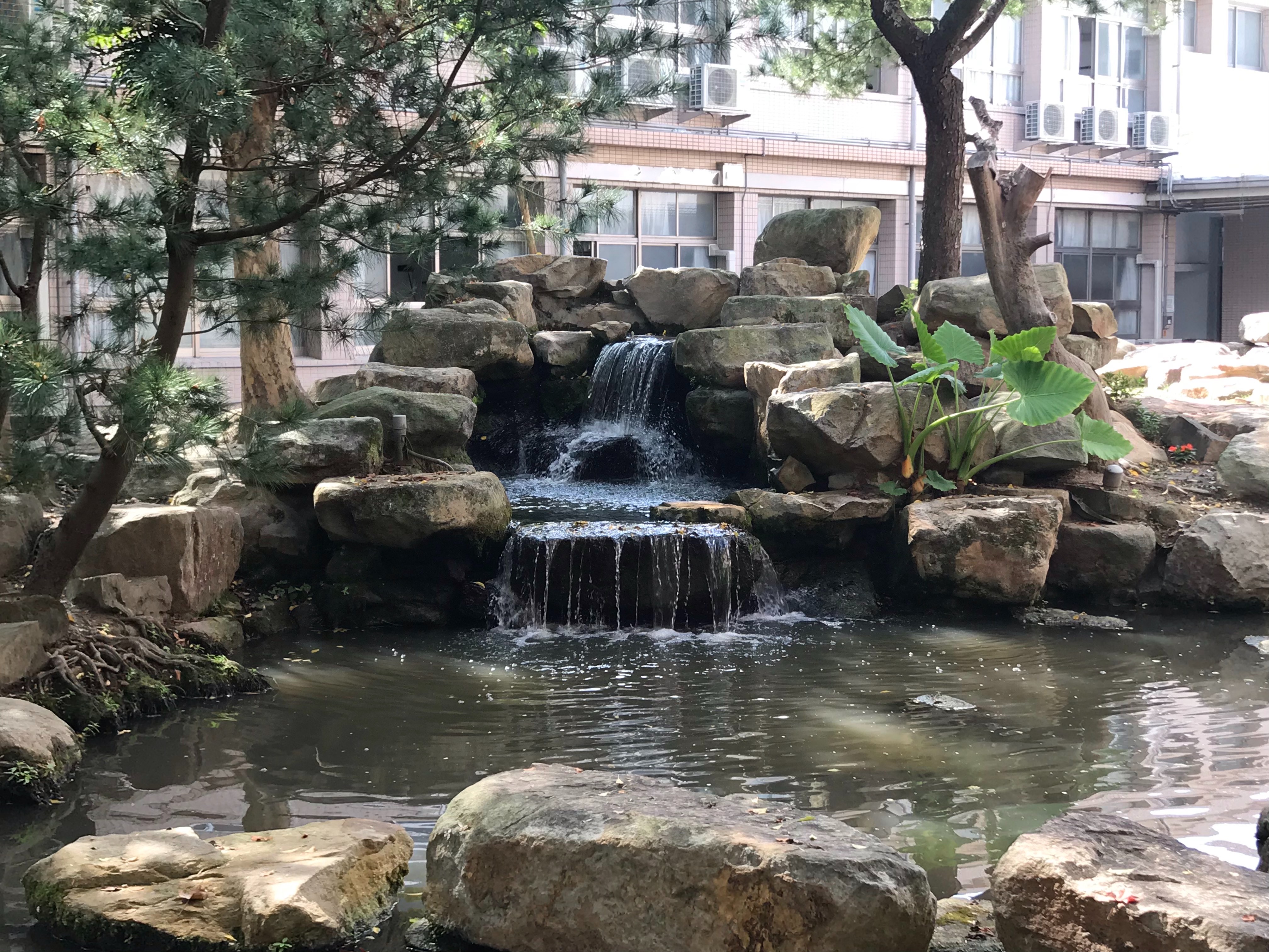正心堂前的聖母亭與聖母園區,是學生喜愛駐足的角落;誠意樓與修身樓之間,與齊家樓前的生態池,增添了校園的自然風景。