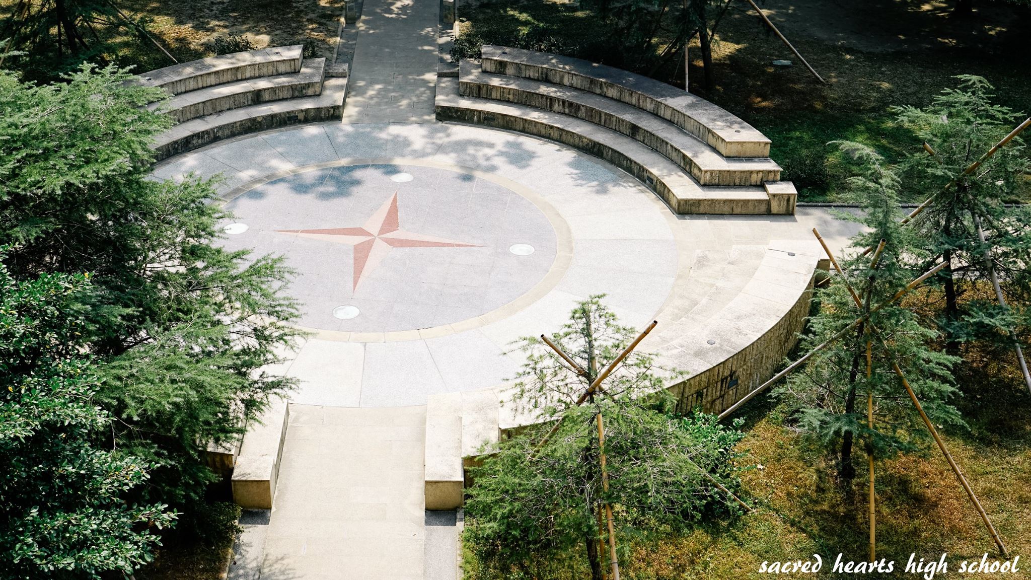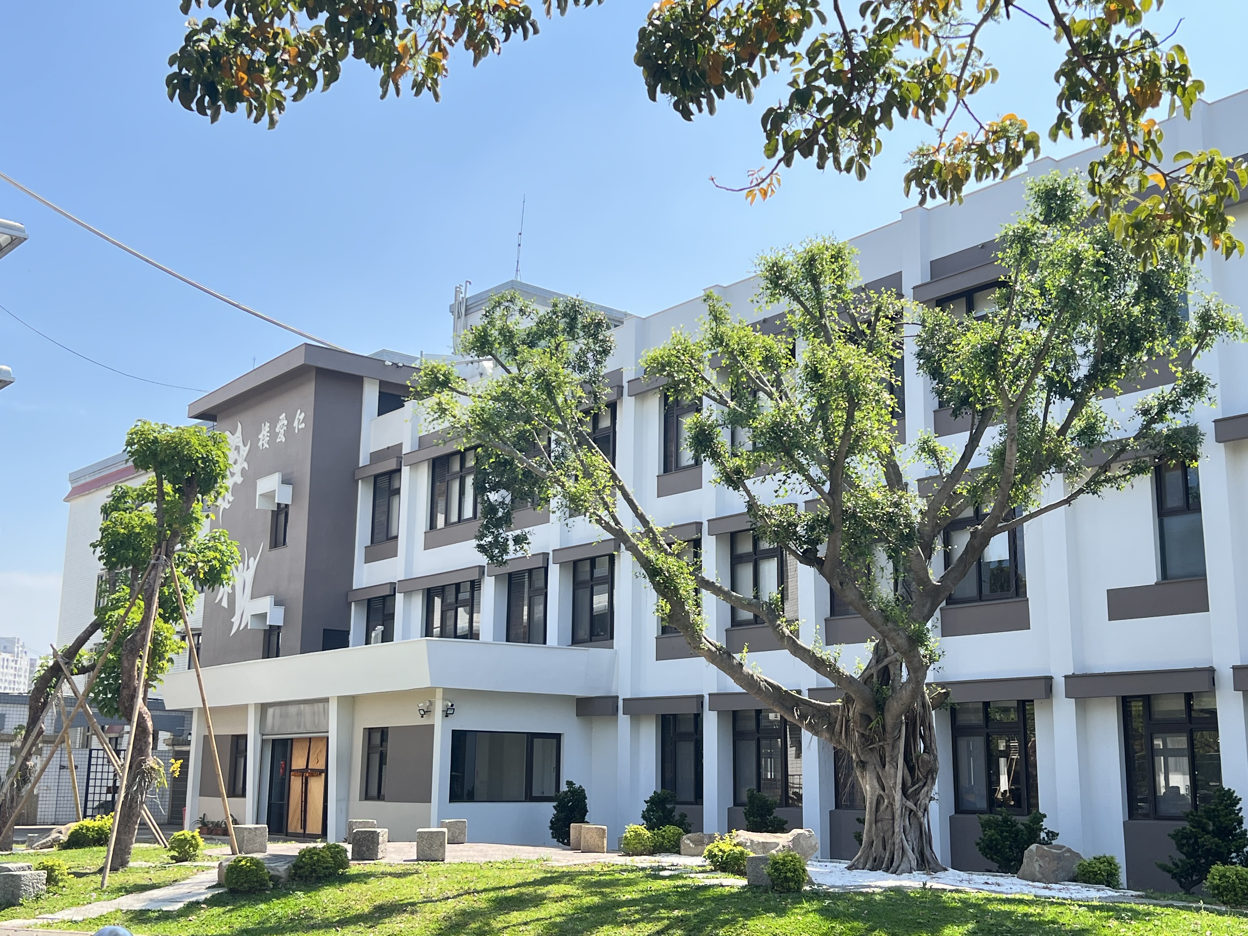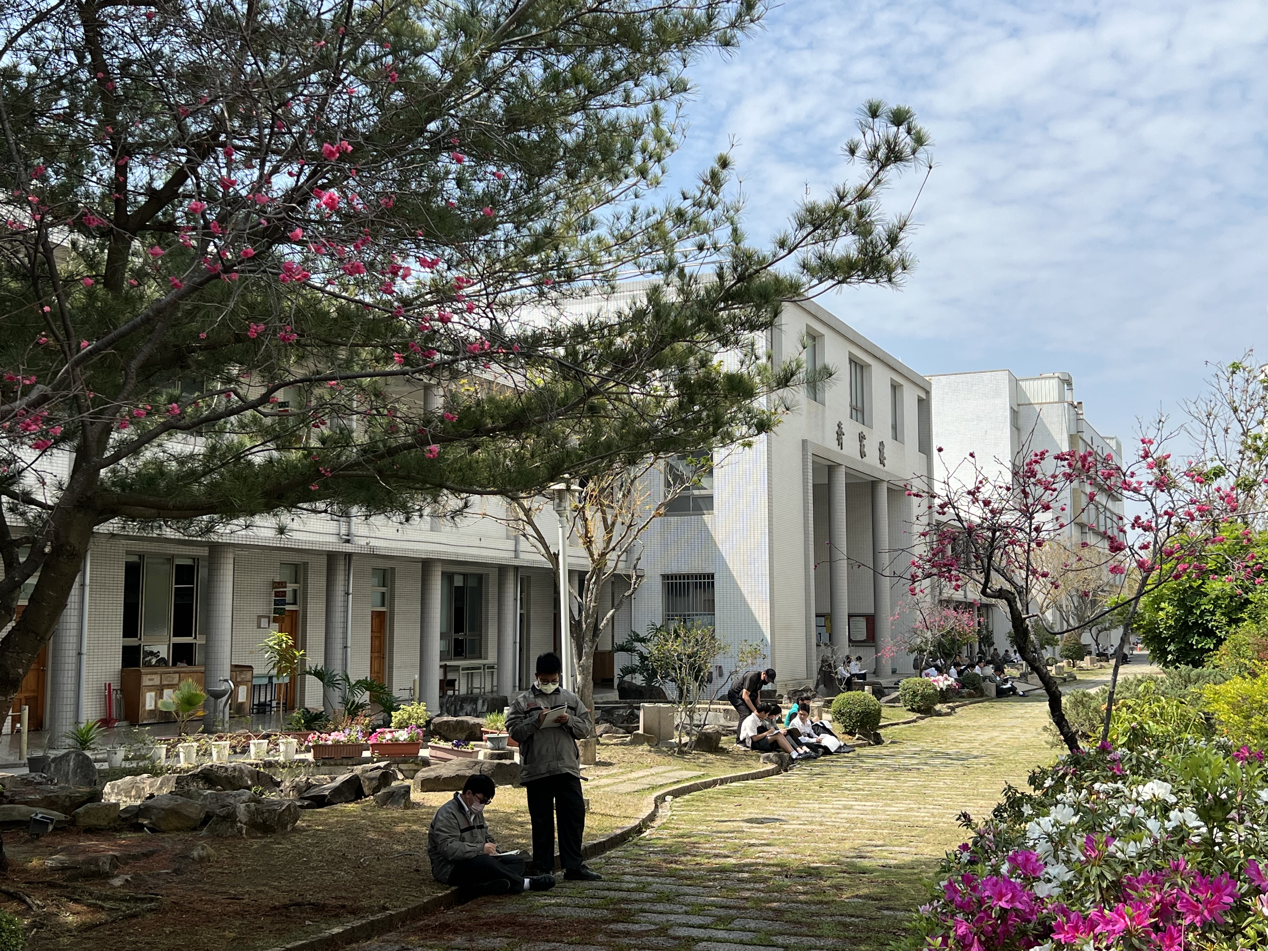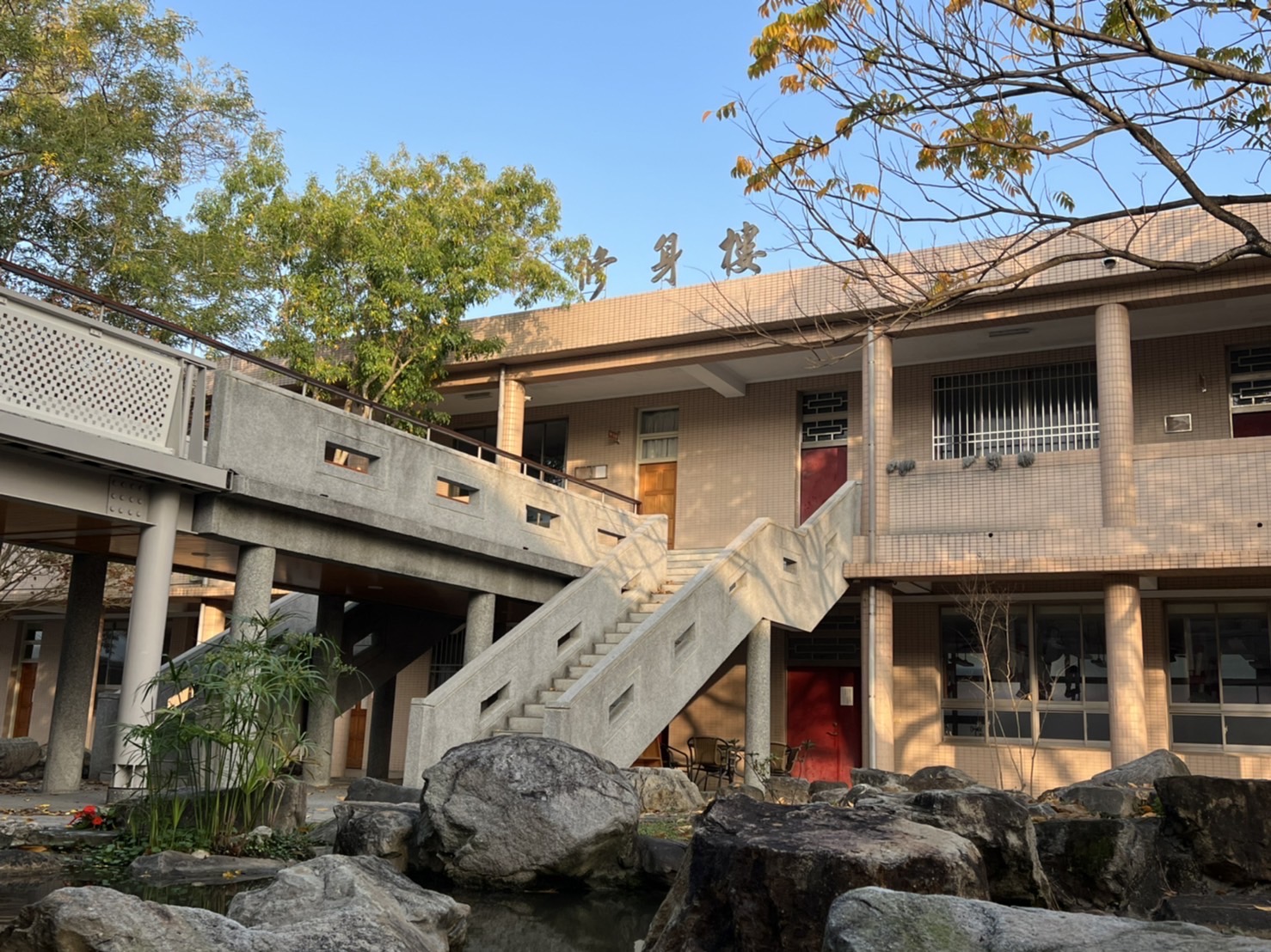 正心堂前的聖母亭與聖母園區,是學生喜愛駐足的角落;誠意樓與修身樓之間,與齊家樓前的生態池,增添了校園的自然風景。