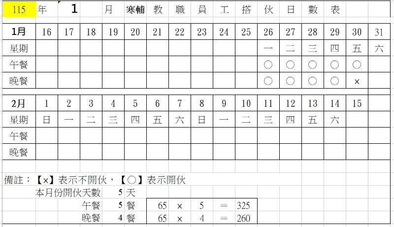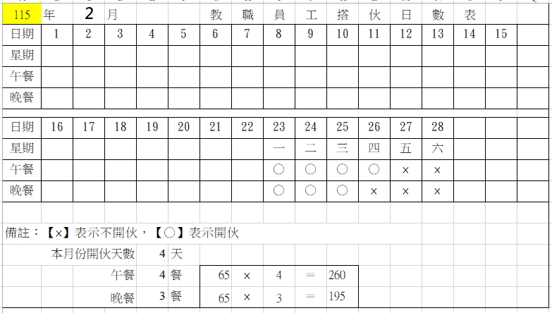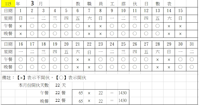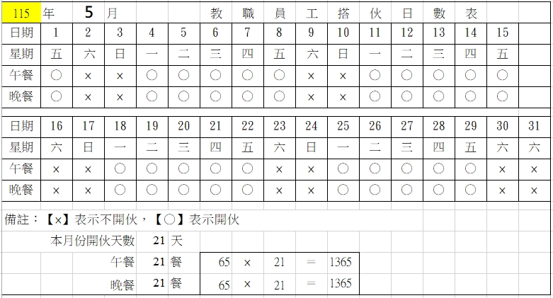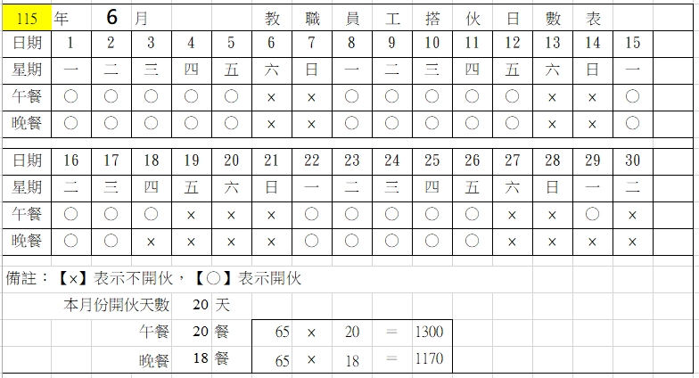 教職員工搭伙日數明細表