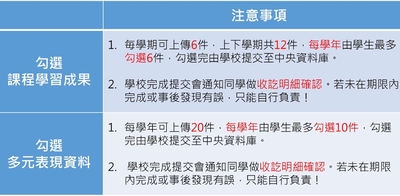 請依學校規定之時程完成資料勾選後,教務處才會將資料提交到中央資料庫,完成提交後會通知你到「學習歷程檔案學校平台(正心首頁/學生專區/高中_學習歷程檔案(巨耀))」完成收訖明細確認,即完成提交。相關注意事項,請參考下表。