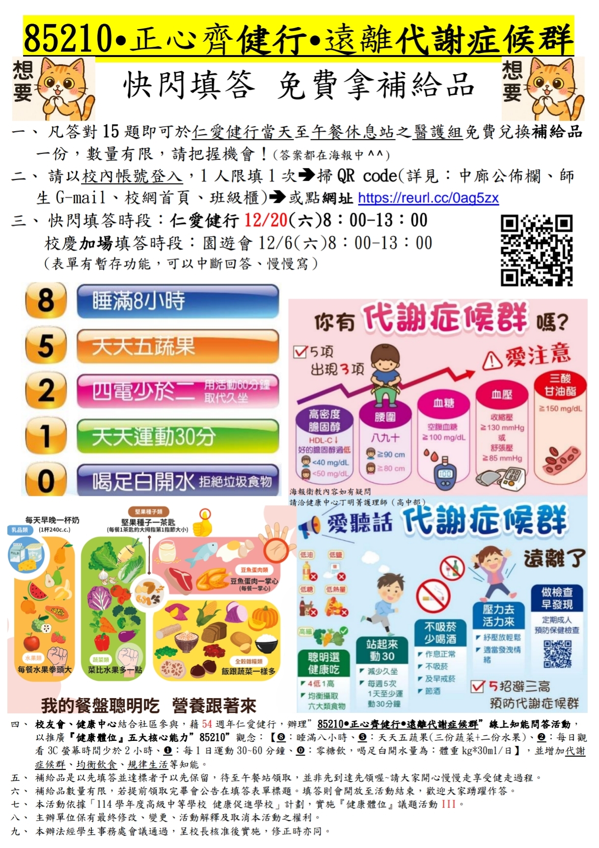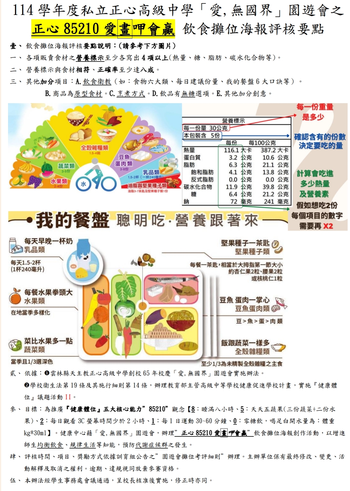 | 公告內容 | “健康體位”二項活動 by 健康中心,活動辦法請參閱附件: 一、正心85210、愛畫才會贏 : 12月6日園遊會飲食攤位海報評核要 二、85210、正心齊健行、遠離代謝症候群 : 12月6日、