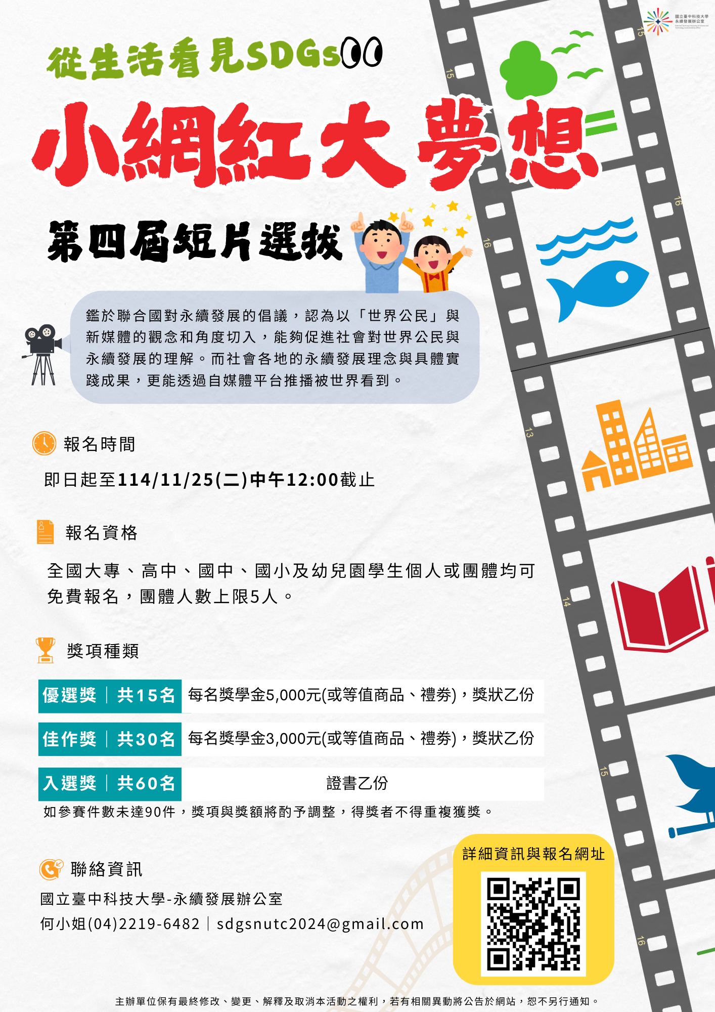 | 公告主旨 | 【轉知】台灣文化創意學會與國立臺中科技大學共同辦理「小網紅大夢想」第四屆短片選拔活動,並舉辦全國線上說明 |