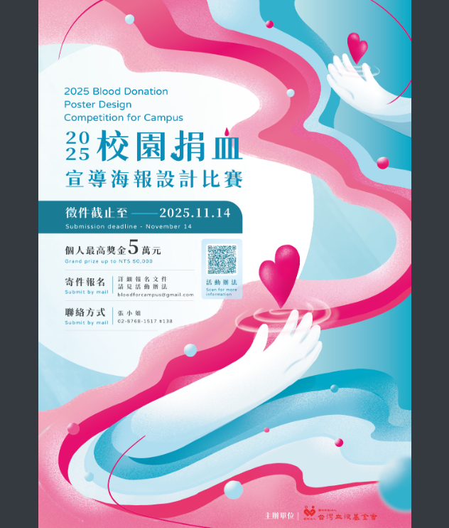 公告內容 | 說明: 一、本會為鼓勵青年族群捐血、加強對自願無償捐血的認知並深化捐血救人觀念,辦理114年校園捐血海報設計比賽;希望透過海報比賽的參與,關注捐血議題,進而融入海報設計創作過程,理解捐血理念和價值,以創作成果體現對捐血救人的認識以及認同。 二、敬請貴校協助宣傳本次活動。 三、活動辦法見附件,並附各式海報圖檔宣傳使用。 |