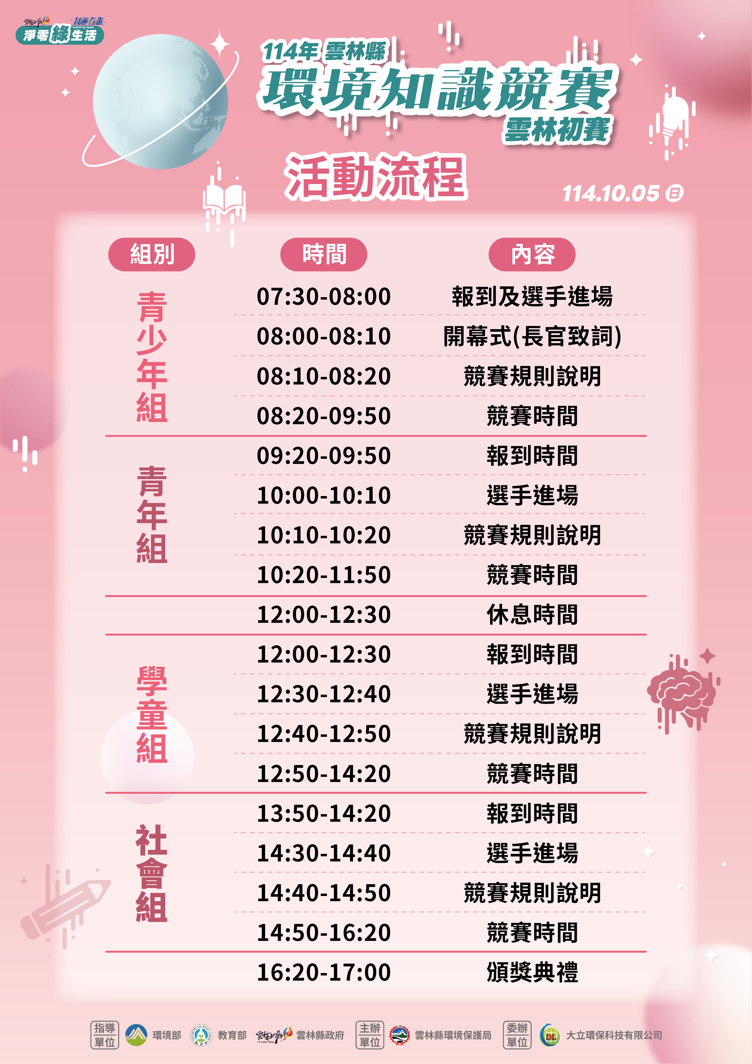 公告主旨 | 【轉知】雲林縣環保局114年10月5日(星期日)辦理「114年環境知識競賽-雲林初賽」活動修正議程表 |