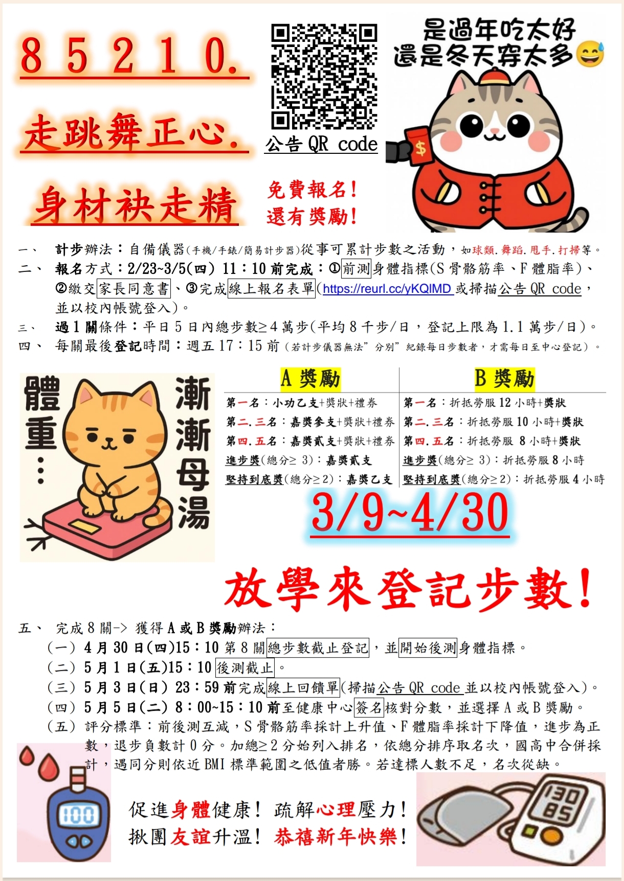 | 公告內容 | 親愛的同學新年快樂🎉 每年下學期為期8週之計步活動~ 2/23~3/5開放報名:https://reurl.cc/yKQlMD 不計算體重增減,主要評比肌肉量增加率、及體脂率降低率二項。 (附件可下拉查閱~)