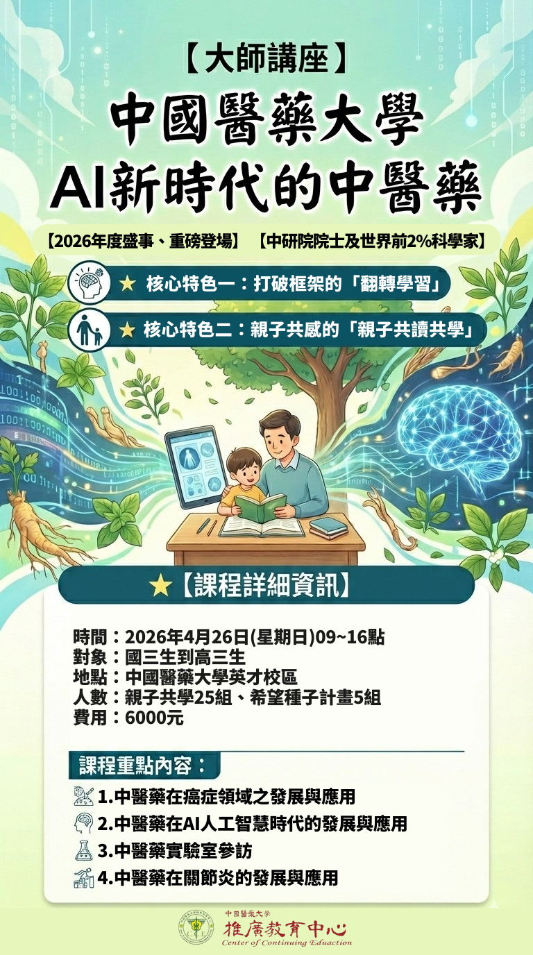 | 公告主旨 | 中國醫藥大學推廣教育中心【2026大師講座】AI新時代的中醫藥之宣傳資料 |