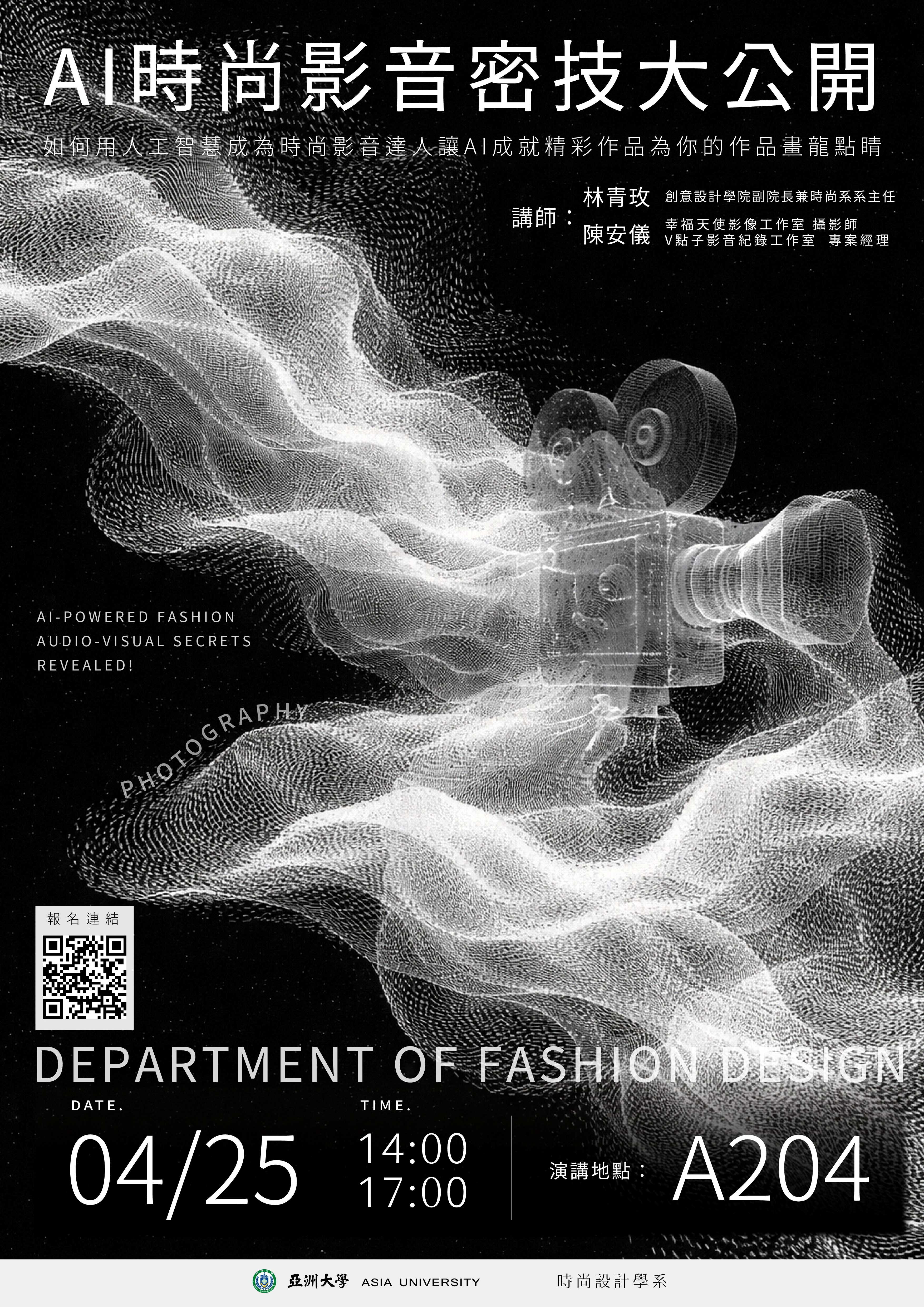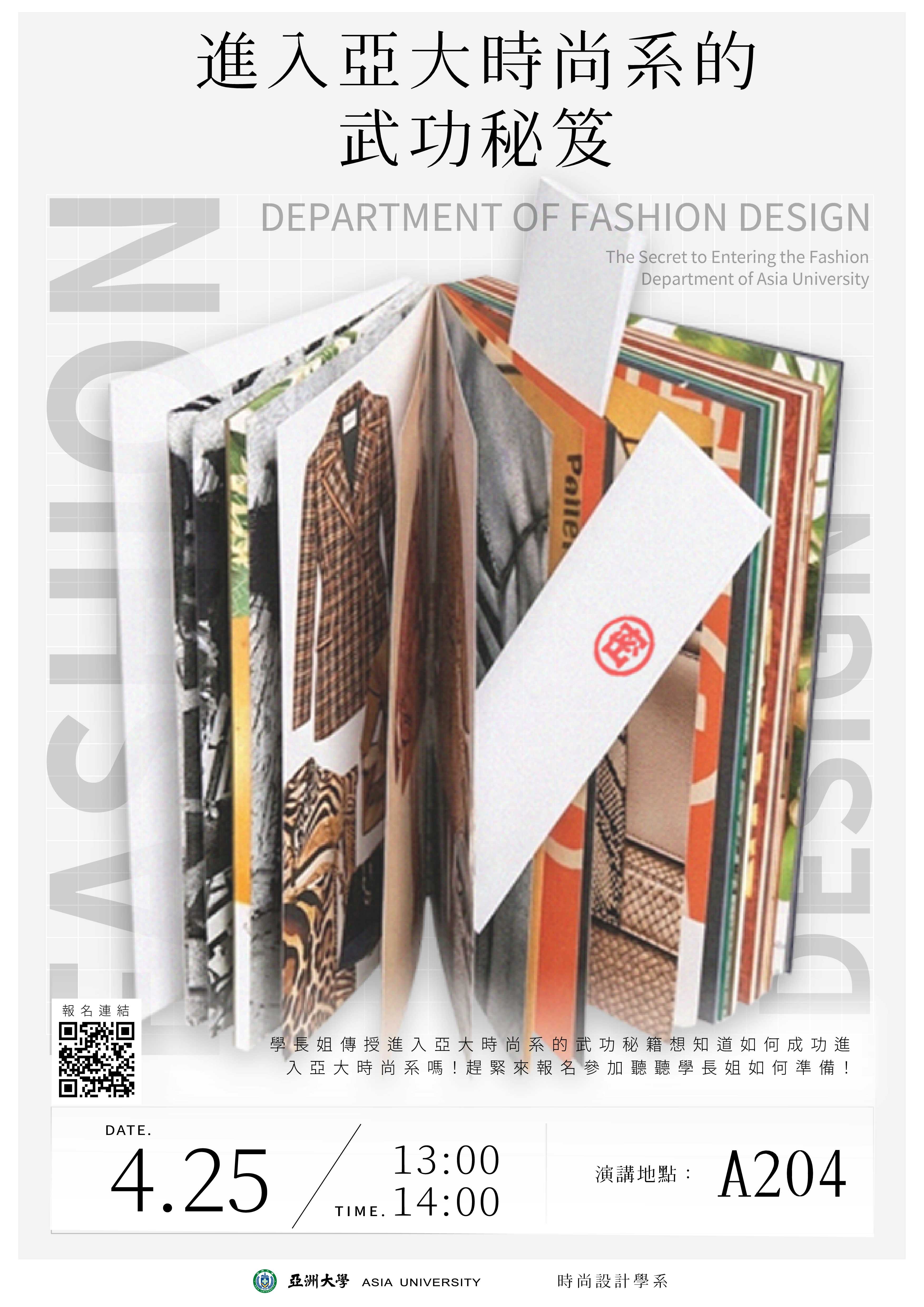 | 公告內容 | 亞洲大學 函 主旨:本校時尚設計學系辦理工作營,敬請貴校協助公告並鼓勵所屬學生踴躍報名參加,請查照。 說明: 一、為協助學生探索時尚設計領域與特色,本校時尚設計學系訂於115年4月25日(星期六)辦理工作營,地點為本校A204教室(亞洲大學A棟創意設計學院大樓2樓)。本次活動共規劃兩場主題工作營,敬請協助轉知貴校學生,並鼓勵踴躍報名參加。 二、工作營一:進入亞大時尚系的武功秘笈(詳附件一),時間:13時至14時。 三、工作營二:AI時尚影音密技大公開(詳附件二),時間:14時至17時。 四、工作營報名連結:https://forms.gle/qFnbspHcTCe5wfqNA。 五、報名期間:即日起至115年4月22日(星期三)17時止。 七、聯絡資訊:亞洲大學時尚設計學系、電話:04-23323456分機1068、E-mail:a-jen@asia.edu.tw。 |