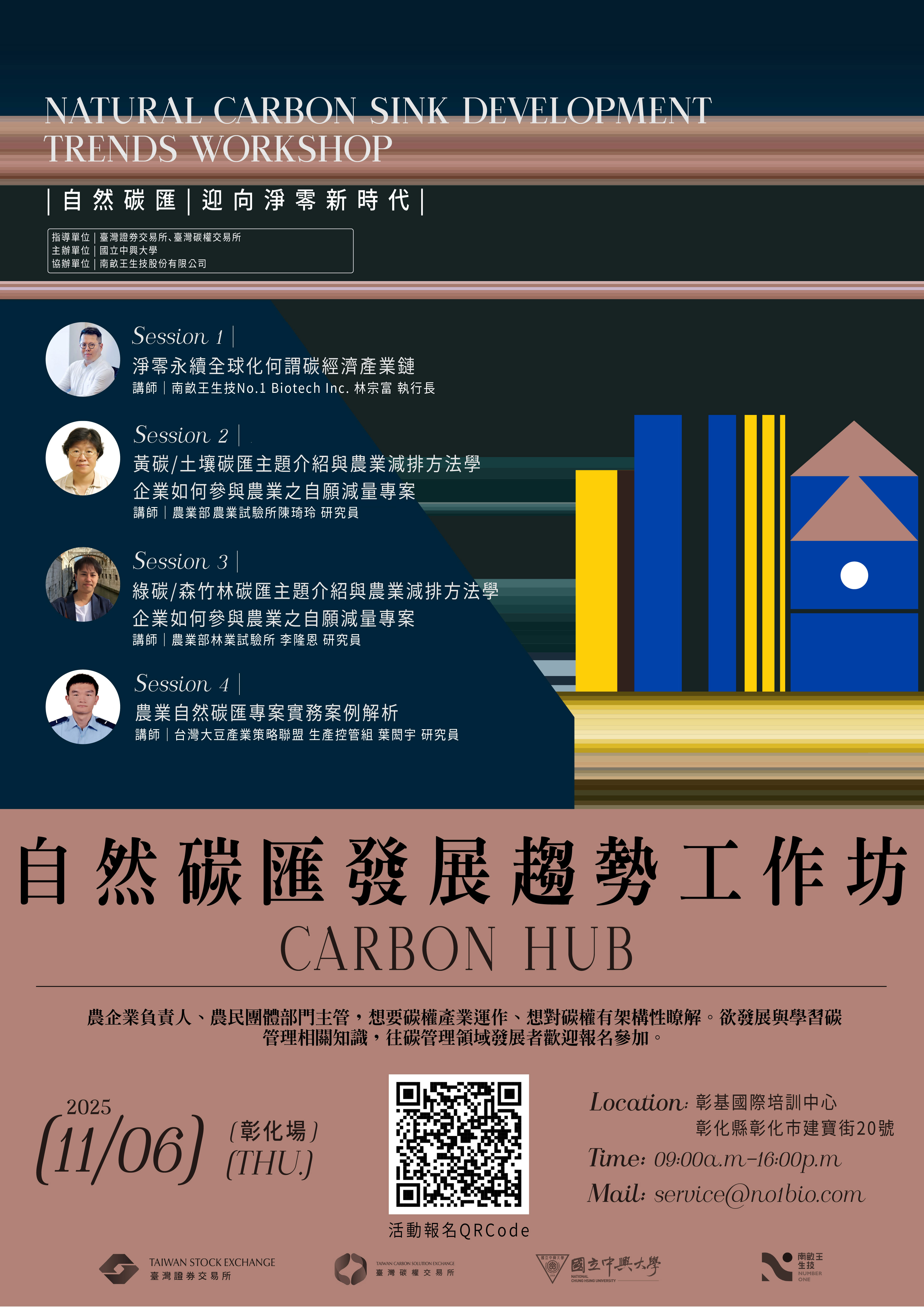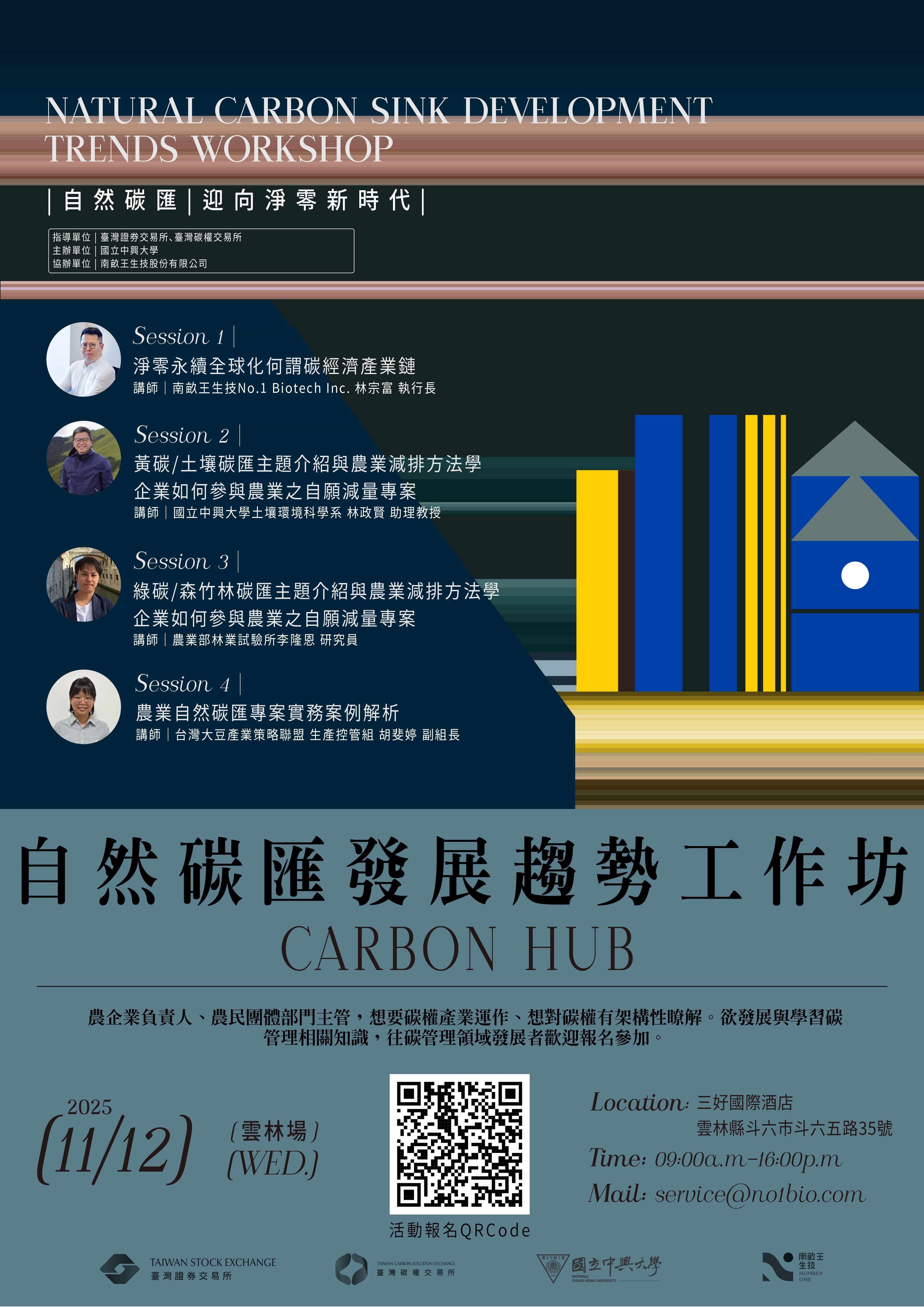 校園公告公告主旨國立中興大學謹訂於114年度辦理3場次「自然碳匯發展趨勢工作坊」發佈日期2025 年 10 月 27 日發佈單位學務處公告類別來文宣導公告等級無點閱次數 12公告內容說明: 一、為響應國家政策,自然碳匯為國發會淨零路徑圖重要戰略之一,因應環境部3月11日推動4項林業類型溫室氣體減量方法之自然碳匯減量方法學,經臺灣碳權交易所委託,邀請農業部農業試驗所、臺中區農業改良場、林業試驗所、中興大學、台灣大豆產業策略聯盟、南畝王生技等專家學者加入,謹訂於10–11月份舉辦相關議題如下,歡迎派員參加。工作坊辦理時間與地點資訊如下: (一)10月30日(四):台中李方艾美酒店。 (二)11月 6日(四):彰化市–彰基國際培訓中心。 (三)11月12日(三):斗六市–三好國際酒店。 三、課程報名方式:請於各場工作坊最晚一周前填寫報名表(https://forms.gle/xdmdXAdj5Sn3jKqf6)報名,以利後續作業。 四、主辦單位:臺灣碳權交易所、臺灣證券交易所。 五、協辦單位:國立中興大學、南畝王生技股份有限公司。 六、工作坊相關問題,請與南畝王生技股份有限公司葉閎宇先生聯繫,電話:(04)22856959∕0980–019636。相關附件國立中興大學謹訂於114年度辦理3場次「自然碳匯發展趨勢工作坊」-1國立中興大學謹訂於114年度辦理3場次「自然碳匯發展趨勢工作坊」-1檔案名稱檔案大小檔案格式下載國立中興大學謹訂於114年度辦理3場次「自然碳匯發展趨勢工作坊」-1.jpg1.63 MB新視窗開啟檔案國立中興大學謹訂於114年度辦理3場次「自然碳匯發展趨勢工作坊」-2.jpg1.40 MB新視窗開啟檔案 國立中興大學謹訂於114年度辦理3場次「自然碳匯發展趨勢工作坊」-1.jpg國立中興大學謹訂於114年度辦理3場次「自然碳匯發展趨勢工作坊」-2.jpg國立中興大學謹訂於114年度辦理3場次「自然碳匯發展趨勢工作坊」-3國立中興大學謹訂於114年度辦理3場次「自然碳匯發展趨勢工作坊」-3檔案名稱檔案大小檔案格式下載國立中興大學謹訂於114年度辦理3場次「自然碳匯發展趨勢工作坊」-3.jpg1.37 MB新視窗開啟檔案國立中興大學謹訂於114年度辦理3場次「自然碳匯發展趨勢工作坊」-4.pdf210.12 KB新視窗開啟檔案 國立中興大學謹訂於114年度辦理3場次「自然碳匯發展趨勢工作坊」-3.jpg國立中興大學謹訂於114年度辦理3場次「自然碳匯發展趨勢工作坊」-4.pdf【2025-10-27】社團法人中華民國應用商業管理協會【2025-10-27】衛生福利部國民健康署辦理「創意拒菸‧等你出手」徵稿活動