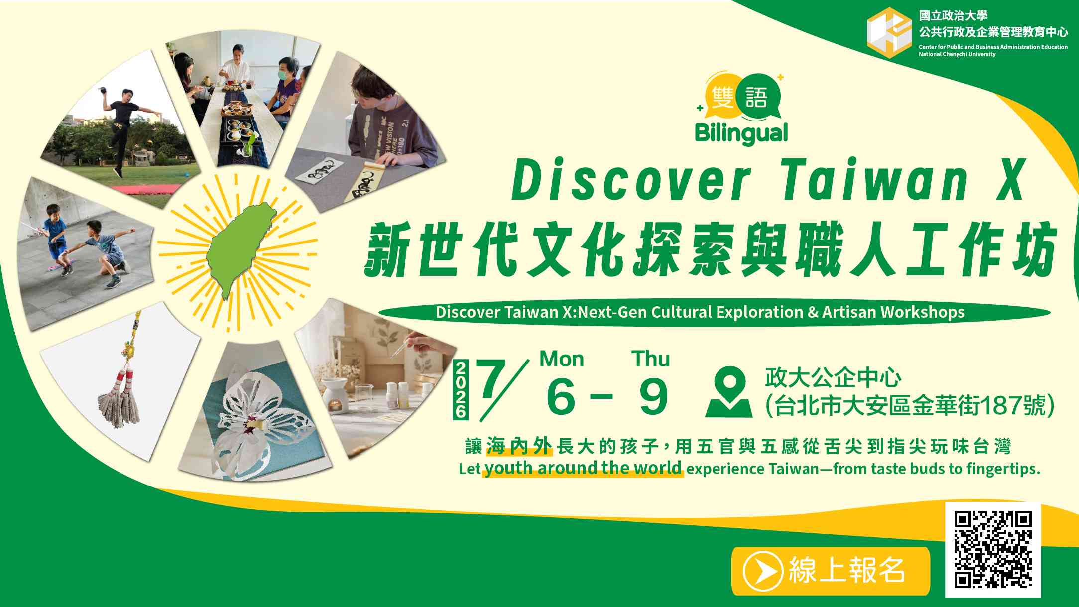 | 公告內容 | 國立政治大學 函 主旨:本校公共行政及企業管理教育中心辦理「Discover Taiwan X 新世代文化探索與職人工作坊」,敬請惠予公告週知並鼓勵學生踴躍參與,請查照。 說明: 一、為鼓勵海內外13至17歲青少年在雙語環境的氣氛下,沉浸式體驗台灣文化的多元性與多樣性,讓青少年們感受 「英語素養」與「台灣文化」的雙向旅程,本校公企中心辦理「Discover Taiwan X 新世代文化探索與職人工作坊」(以下簡稱本營隊)。 二、本營隊師資由本校商學院別蓮蒂特聘教授與各文化領域職人親自帶領,大師領軍的頂尖師資,開啟青少年的新視野。 (一)藉由文化體驗融入英語素養的學習情境:全程「雙語並行」,讓英文不再是課本考題,而是探索文化的工具。 (二)靜動平衡的五感體驗:將東方文化融入武術律動、茶席文化、職人手作、漢字藝術的學習之中,讓學習在體驗中發生,並將學習體驗衍生成作品,作為營隊學習過程之具體成果。 三、營隊資訊:「Discover Taiwan X 新世代文化探索與職人工作坊」擬訂於民國115年7月6日至7月9日辦理。網址:https://cpbae.nccu.edu.tw/cpbae/class?id=all&classId=N8D2B5071。 五、營隊聯絡人:02-2341-9151分機2364 郭小姐;02-2341-9151分機2365蕭小姐。 |