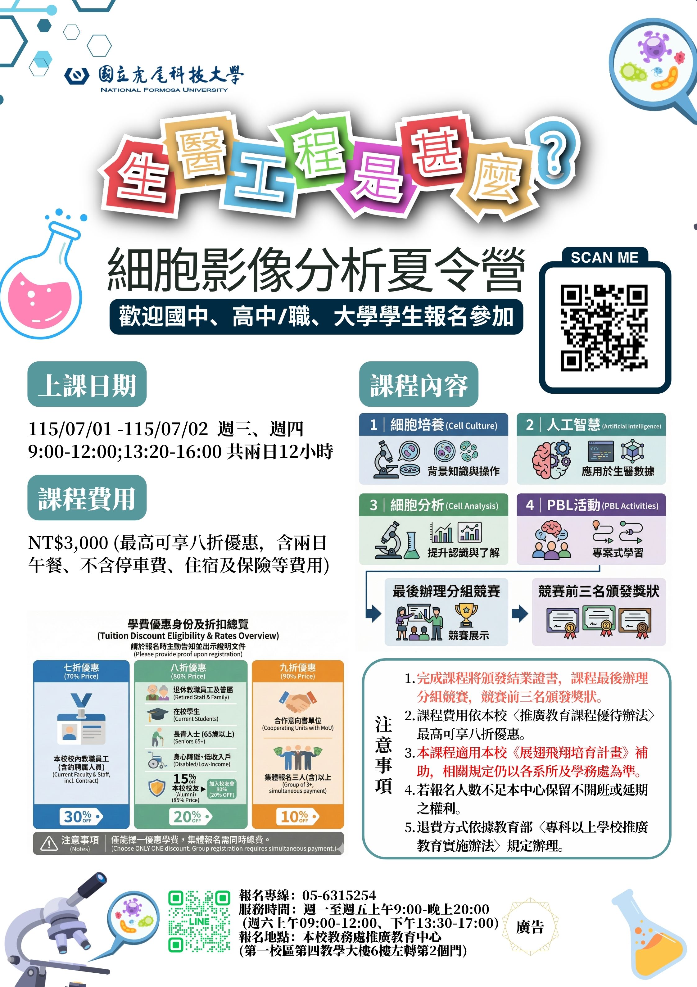 | 公告內容 | 國立虎尾科技大學 函 主旨:檢送本校教務處推廣教育中心辦理115年度「生醫工程是甚麼?細胞影像分析夏令營」海報,請惠予公告,並轉知所屬踴躍報名參加,請查照。 說明: 一、今年暑假本校特別推出精彩實作課程,帶領學員從基礎到應用,全面體驗生醫工程的核心技術。將由專業師資帶領學員實際進行細胞培養操作,並導入人工智慧(AI)與大數據分析技術,學習如何進行細胞影像判讀與分析,強化實務能力與跨領域整合思維。 二、全程參與之學員可獲得結業證書,課程尾聲將舉辦分組成果競賽,表現優異之前三名隊伍將頒發獎狀,以資鼓勵。 三、招生對象:歡迎國中、高中職及大學學生報名參加。 四、報名時間:即日起至115年6月16日(二) 或50人額滿為止。 五、課程時間:115年7月1日~115年7月2日週三至週四 9:00-16:00 共兩日,課程時段及相關說明請參閱附件簡章。 六、課程費用:NT$ 3,000 元(依據本校課程優待辦法最高享8折優惠,含兩日午餐、不含停車費、住宿及保險等費用)。 七、報名請掃描附件海報中的QR Code或加入本中心官方LINE@: https://lin.ee/rtIVYzO(可自行輸入ID @670cvvws ),或電洽05-631-5254。 |