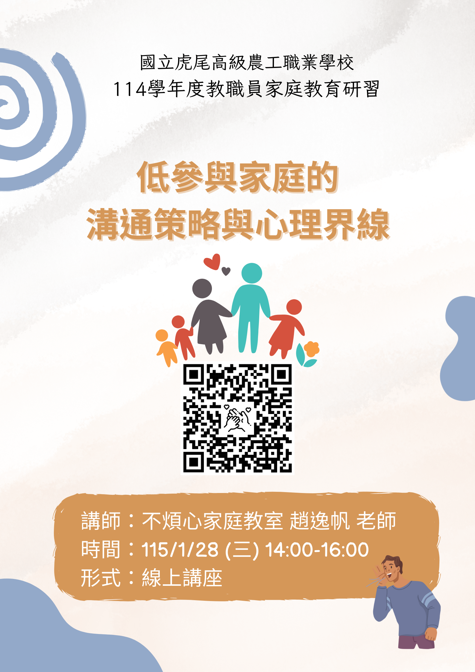 | 公告主旨 | 國立虎尾高級農工職業學校辦理114學年度「家庭教育暨親職教育-低參與家庭的溝通策略與心理界線」線上研習講座 |