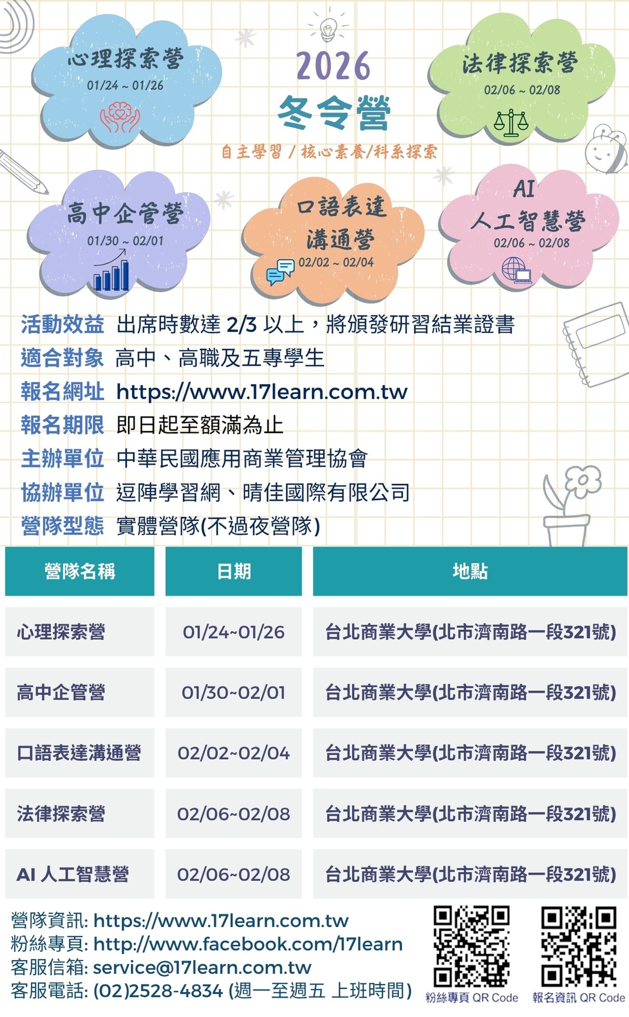 | 公告內容 | 晴佳國際有限公司 函 四、適合對象: 全國公私立高中、高職、五專學生 (一)心理探索營:2026/1/24(週六)~2026/1/26(週一) (二)高中企管營:2026/1/30(週五)~2026/2/1(週日) (三)口語表達溝通營:2026/2/2(週一)~2026/2/4(週三) (四)法律探索營:2026/2/6(週五)~2026/2/8(週日) (五)AI人工智慧營:2026/2/6(週五)~2026/2/8(週日) 六、活動官網與報名網址: https://www.17learn.com.tw 七、營隊介紹與上課地點:請詳見活動官網說明 八、報名期限:即日起至額滿為止。 九、其他事項: 如營隊與寒輔撞期,可提供報名證明,方便學員請假。有關營隊問題,歡迎函詢課務中心: service@17learn.com.tw,或是私訊粉絲專頁:https://www.facebook.com/17learn |