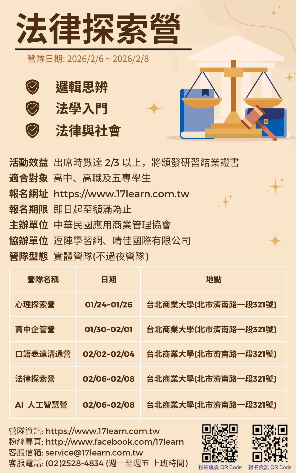 | 公告內容 | 晴佳國際有限公司 函 一、營隊特色:專家授課:介紹基礎法學與生活應用。體驗式學習:經由法律辯論、模擬法庭的活動,有做中學,有效提升學習成果。分組活動討論,透過團體遊戲與體驗探索活動進行。 |