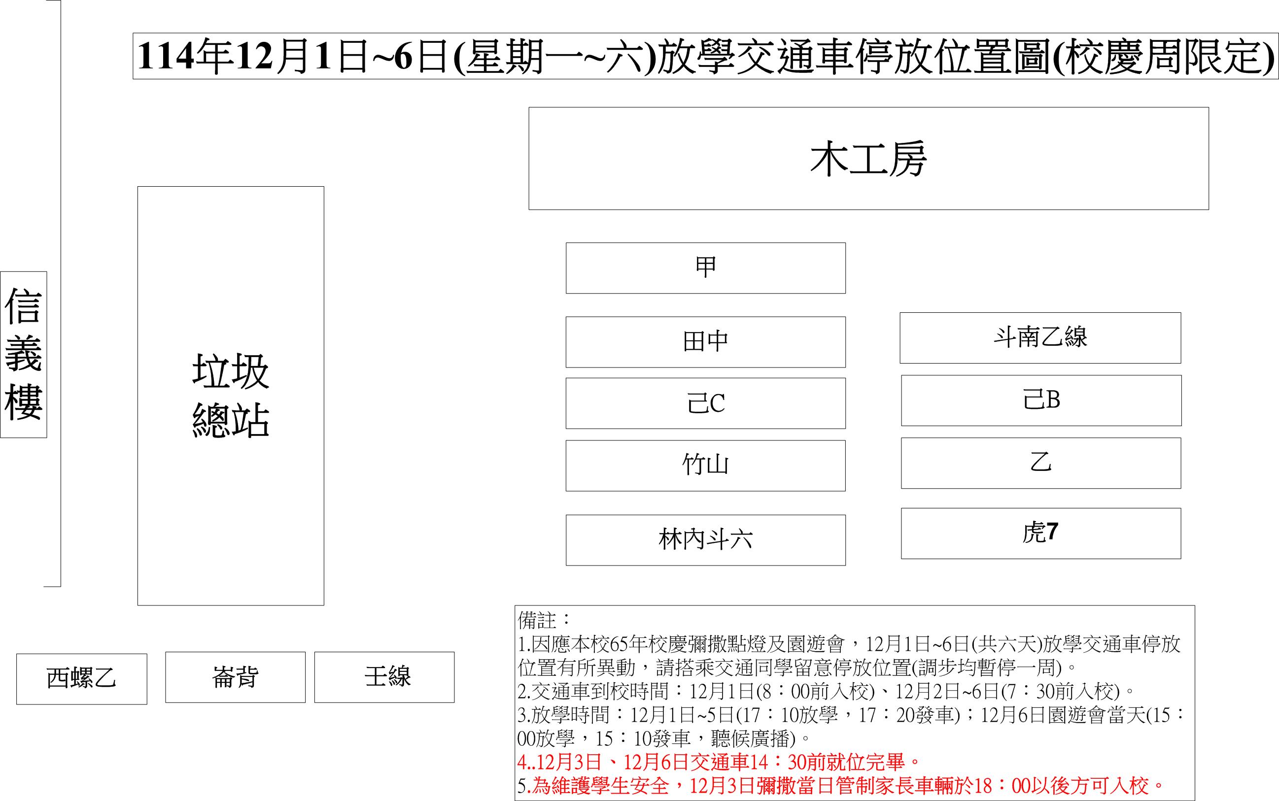 | 公告內容 | 本校12月1日至12月6日校慶彌撒點燈及園遊會交通注意事項: 一、因應本校65年校慶彌撒點燈及園遊會場地布置,12月1日~6日(共六天)放學交通車停放位置有所異動,請搭乘交通同學留意停放位置,以免搭錯車(調步暫停一周)。交通車停放位置圖如附件。 二、上學時間:12月1日(8:00前到校)、12月2日~6日(7:30前到校)。 三、放學時間:12月1日~5日(17:10放學,17:20發車);12月6日園遊會當天(15:00放學,15:10發車,請聽候廣播)。 四、請留意:12月6日(六)園遊會當天上學交通車路線、發車時間,比照星期二~五路線及搭車時間。 五、為維護學生安全,12月3日彌撒當日管制家長車輛於18:00以後方可入校,感謝家長的配合。 |