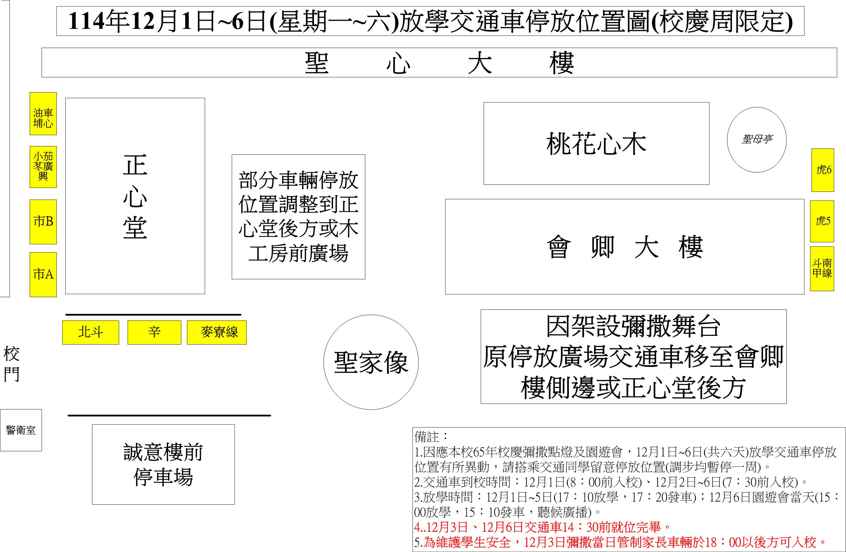 | 公告主旨 | 本校12月1日至12月6日校慶彌撒點燈及園遊會交通注意事項 |