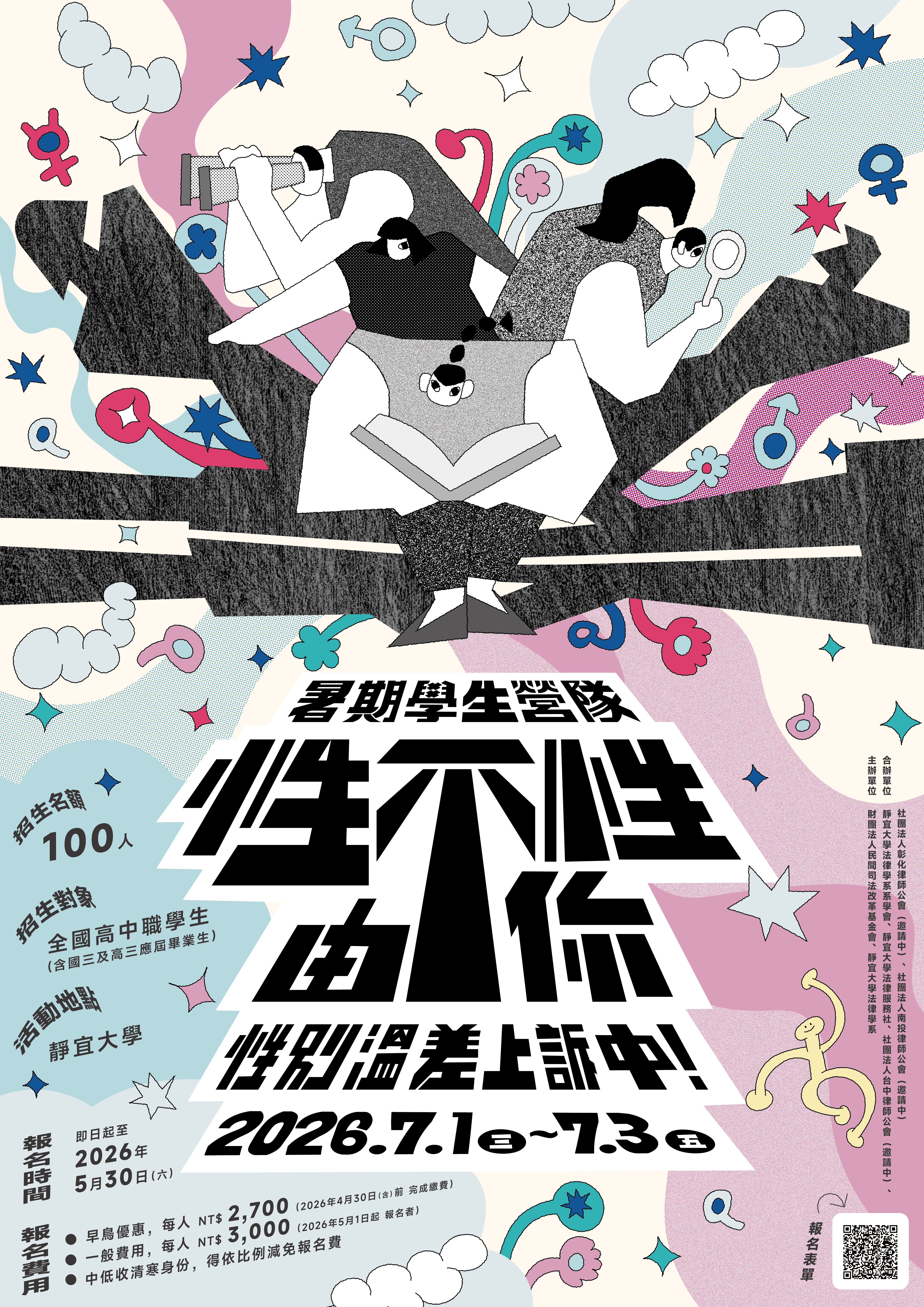 | 公告內容 | 靜宜大學 函 主旨:本校法律學系與財團法人民間司法改革基金會共同辦理暑期學生營隊【性不性由你—性別溫差上訴中!】開放報名中,敬請惠予公告並鼓勵貴校同學踴躍報名參加,請查照。 一、營隊宗旨:透過性別與法治議題探討、司法實務體驗及模擬法庭演練,引導學生覺察社會中的性別偏見,培養法治思辨能力與公共參與意識。 二、活動日期:115年7月1日(週三)至7月3日(週五),共三天,提供餐點及住宿。 三、活動與住宿地點:靜宜大學(臺中市沙鹿區臺灣大道7段200號) 四、參加對象:全國各地高中職學生100人,以完成繳費先後順序錄取之。 五、活動費用: (一)早鳥優惠:每人NT$2,700(115年04月30日前(含)完成繳費者)。 (二)一般費用:每人NT$3,000(115年05月01日起報名者)。 六、報名日期:即日起至115年5月30日(週六)報名截止。 七、報名網址及活動詳細說明:靜宜大學法律學系網頁(https://law.pu.edu.tw/index.php)或財團法人民間司法改革基金會網頁(https://www.jrf.org.tw/)。 |