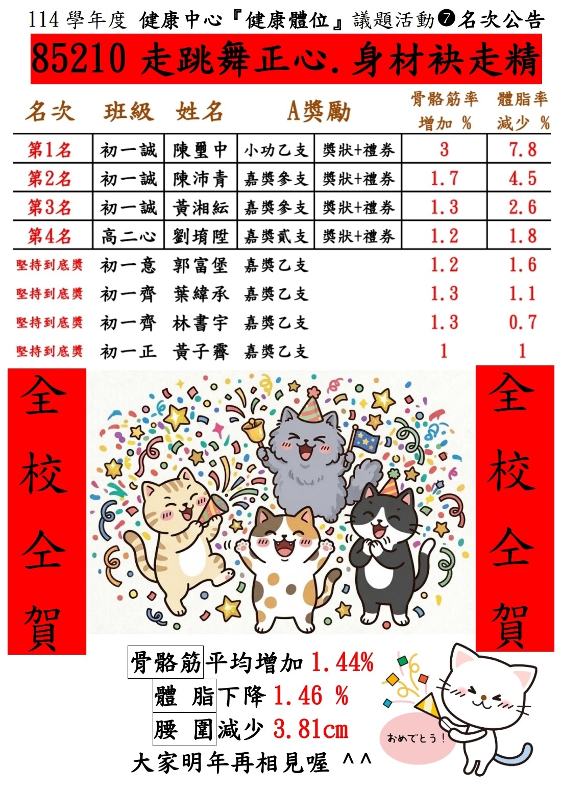 校園公告 公告主旨 85210.走跳舞正心.身材袂走精-獲獎名單 發佈日期 2026 年 4 月 29 日 發佈單位 健康中心 公告類別 行政公告, 活動競賽 公告等級 無 點閱次數 11 公告內容 相關附件 【2026-04-29】國立清華大學114學年度暑假期間辦理營隊資訊 【2026-04-29】國立清華大學社團科學服務辦理「115年暑期高中生科學探索營」