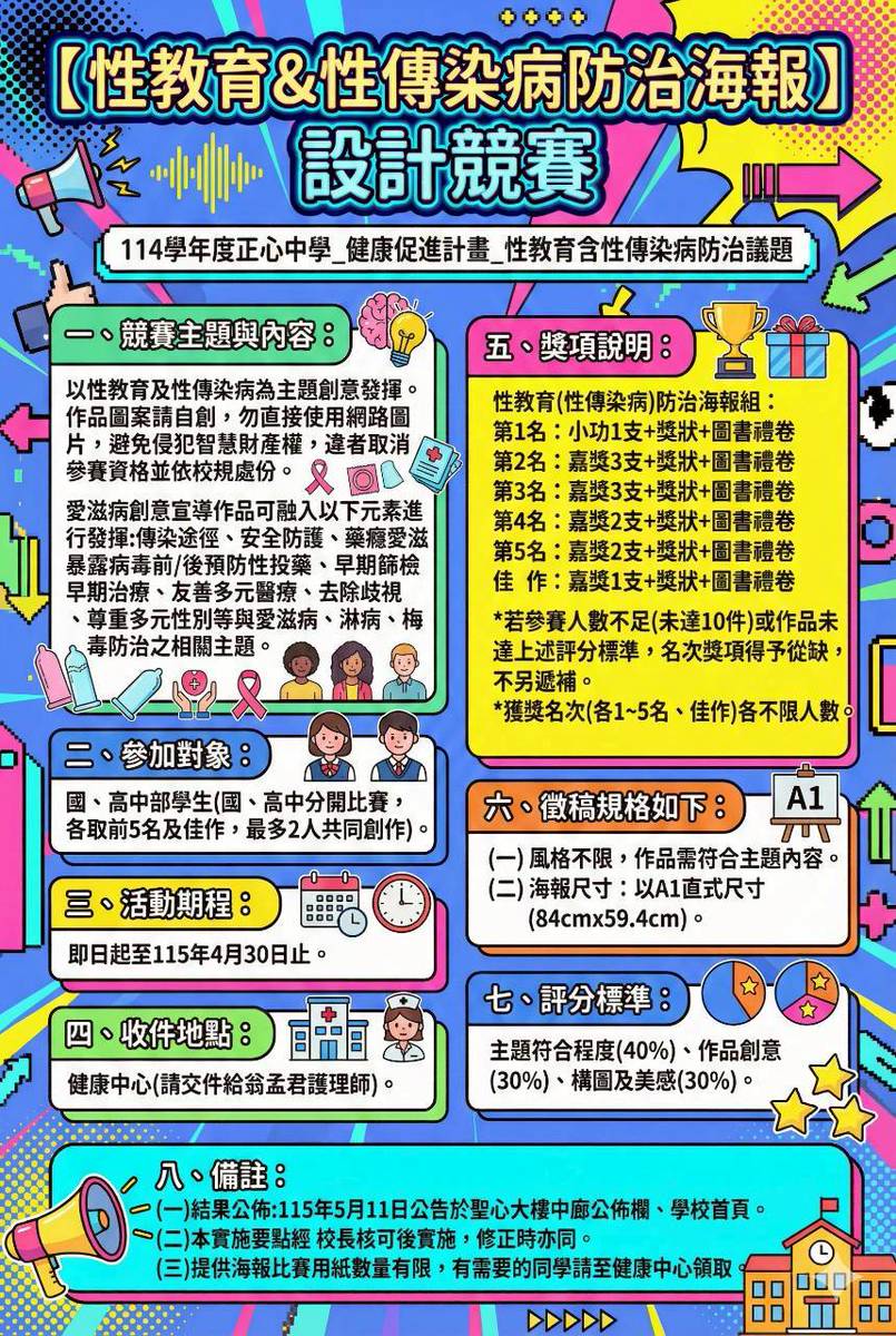 校園公告 公告主旨 健康促進計畫:性教育與性傳染病海報比賽 收件截止日115/4/30 發佈日期 2026 年 1 月 27 日 發佈單位 學務處 公告類別 行政公告, 未分類, 活動競賽 公告等級 無 點閱次數 16 公告內容 相關附件 健康促進計畫性教育與性傳染病海報比賽 健康促進計畫性教育與性傳染病海報比賽 檔案名稱檔案大小檔案格式下載健康促進計畫性教育與性傳染病海報比賽.jpg270.85 KB新視窗開啟檔案 健康促進計畫性教育與性傳染病海報比賽.jpg 【2026-01-27】開南大學國際企業學系辦理「未來無人機科技人才培育營」 【2026-01-26】2026解剖學實作體驗研習營